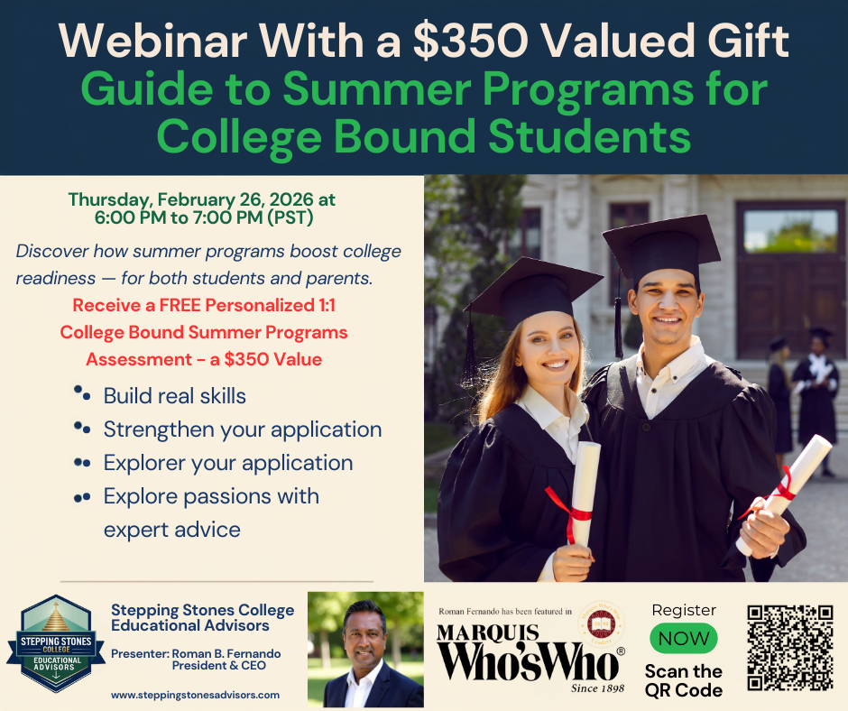 Also, attend live and receive a free customized Summer Program for College Bound Students personalized report of programs customized for your student. A $350 package.